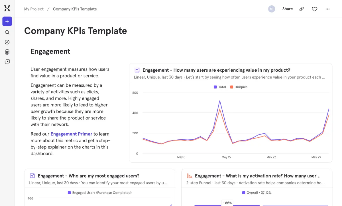 Foundational views to monitor product health, user retention, and core growth metrics at a glance.